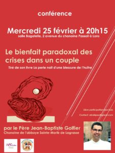 À partir de son livre La perle naît d’une blessure de l’huître, Jean-Baptiste Golfier, chanoine de l’abbaye Sainte-Marie de Lagrasse, propose une réflexion sur le bienfait paradoxal des crises dans un couple.